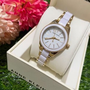 The Anne Klein Gold-Tone AK-3212WTGB women’s watch is a model that runs on battery power, guaranteeing extraordinary comfort of use and precision of operation. The Japanese mechanism used in the watch guarantees reliability and high working culture, and the timeless design of this model will appeal to lovers of elegant and classic additions to an outfit. The dial of the watch is dominated by white color, which adds to its elegance and femininity.