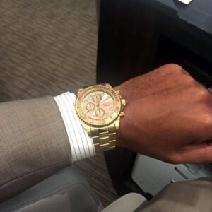 The champagne-colored dial features luminescent hands and indexes. The watch’s all-steel envelope and bracelet are gold-colored.