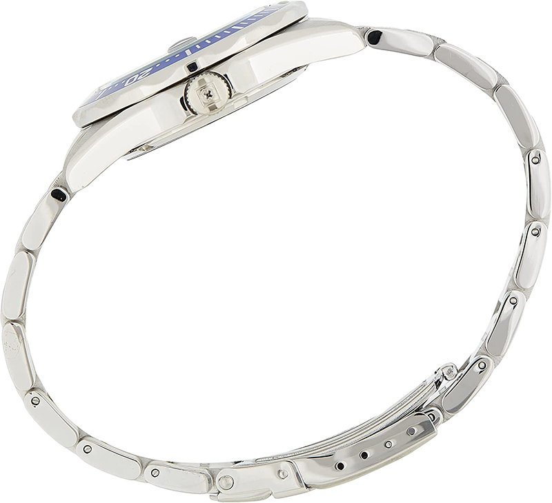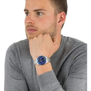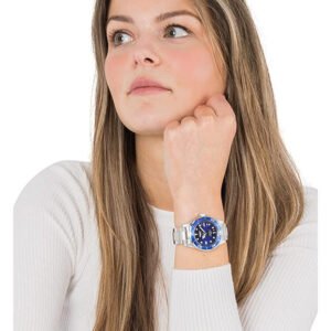 The blue dial features a date display indicating the days of the month with a magnifying glass, as well as hands and indexes coated with luminescent Tritnite
