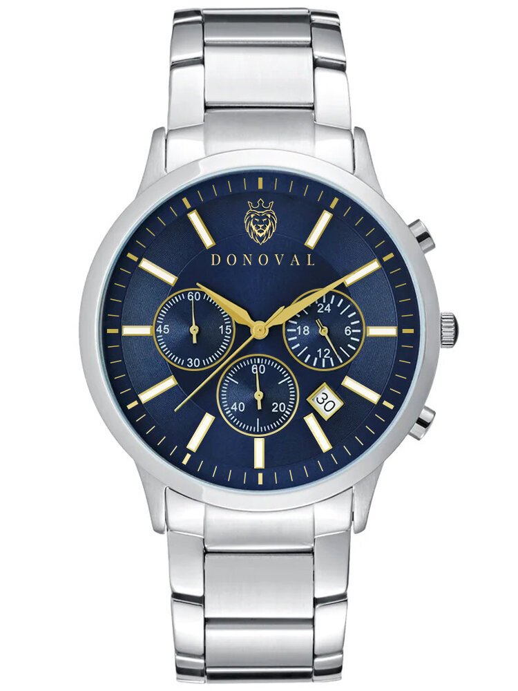 The Donoval Chronostar DL0024 wristwatch is an elegant, classic men’s timepiece – ideal for everyday wear, as well as for special occasions. The envelope and bracelet are made of stainless steel – this ensures many years of durability. On the navy blue dial protected by mineral glass you will find the day of the month date, subdials that are chronograph indications and hour markers in white and gold. The watch is powered by a Miyota quartz movement.