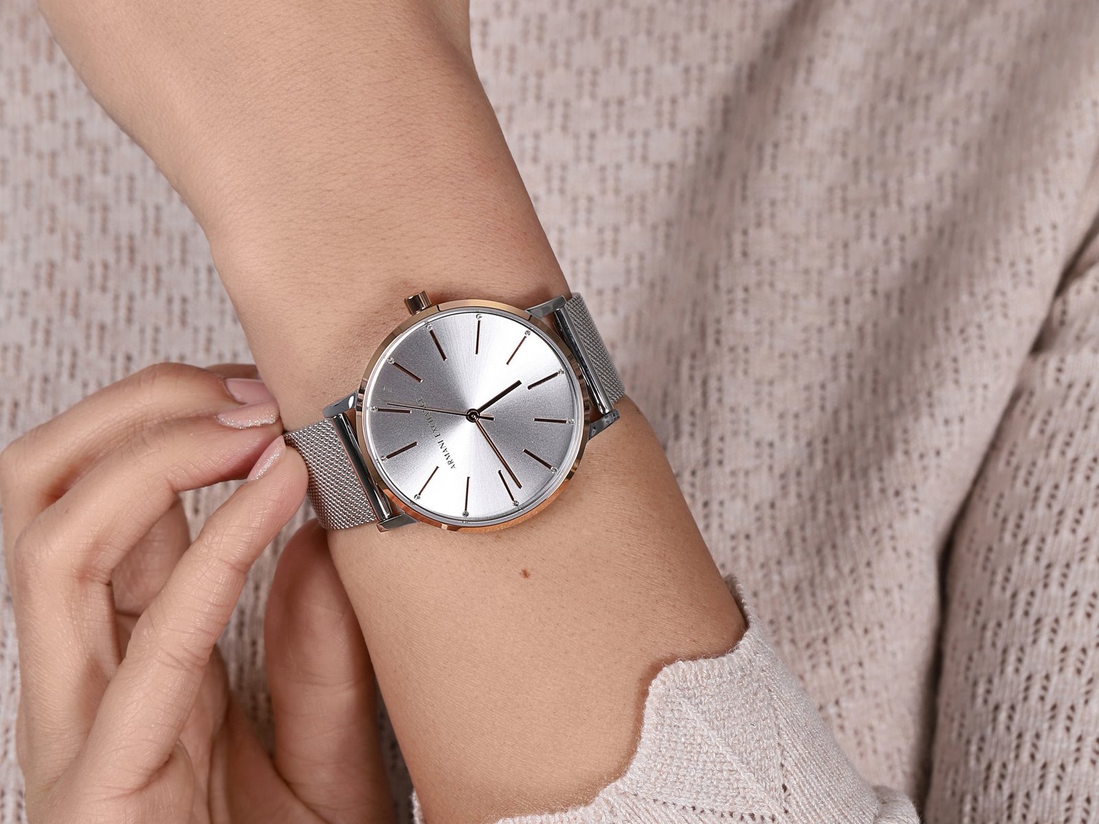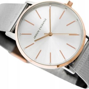 Armani Exchange to pełnoprawna marka stworzona przez znanego na całym świecie projektanta Giorgio Armaniego, zachowując tą samą jakość i prestiż,co jej bliźniacza marka Emporio Armani czy Armani Jeans. Również zasila sektor dóbr luksusowych. W tym przypadku jednak wśród odbiorców są głównie osoby młode. Zegarek Armani Exchange AX5537 swój modny design zawdzięcza rewelacyjnemu połączeniu koperty w kolorze różowego złota, z bransoletą typu mesh i srebrną tarczą. Ten damski model znakomicie sprawdzi się jako modny dodatek na nadgarstku każdej nowoczesnej kobiety. Jak wszystkie zegarki AX w niesamowity sposób łączy w sobie markowy design, najmodniejsze trendy oraz ponadczasową, wyrafinowaną elegancję.