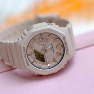 The Casio GMA-S2100-4AER youth watch has a stopwatch, timer, alarm, world time, date, perpetual calendar, backlight. The modern Casio GMA-S2100-4AER watch also has functions typical of the G-SHOCK series, is shockproof and waterproof at 200M which allows swimming, surface swimming and even submerging with an aqualung to about nine meters. The watch’s envelope and strap are made of lightweight plastic in powder pink, which is very durable and perfectly matches the bright interior of the timepiece, which is also in the same color.