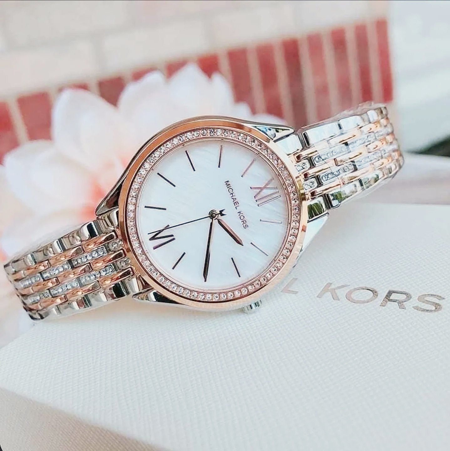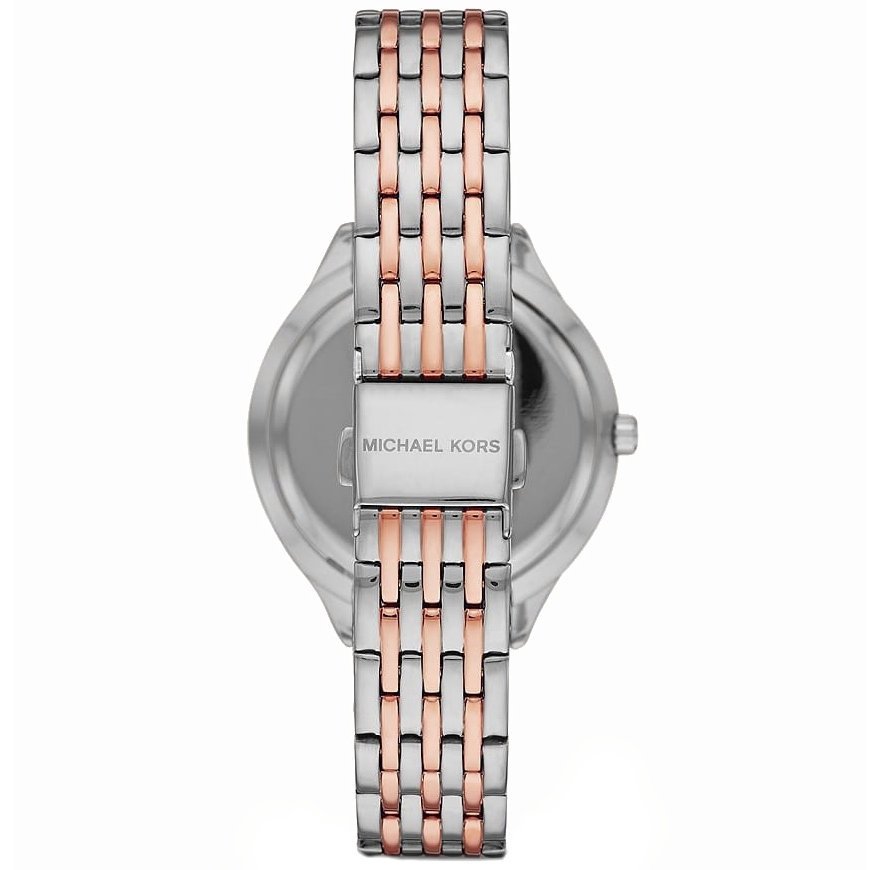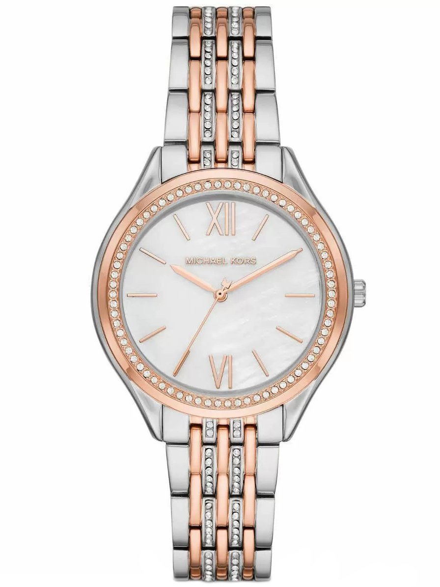 Michael Kors MK7077 watch is a stylish women’s timepiece. The envelope and bracelet are made of stainless steel, which guarantees long-lasting resistance to damage. Some of the steel elements are coated in rose gold, which gives the timepiece an intriguing contrast. The zircons on the rim and the bracelet complement the whole.