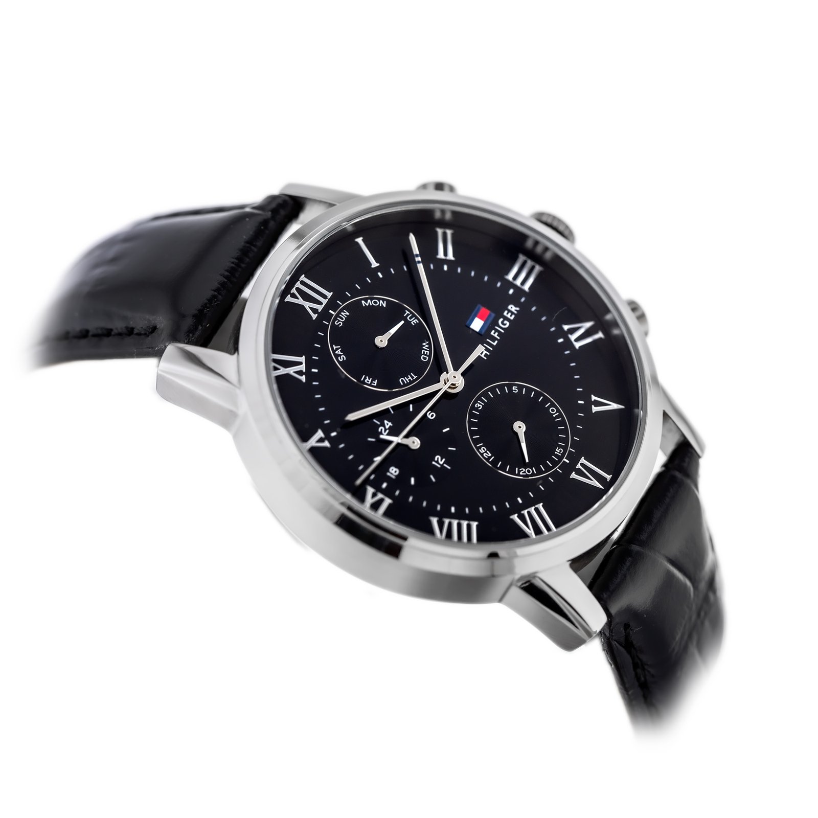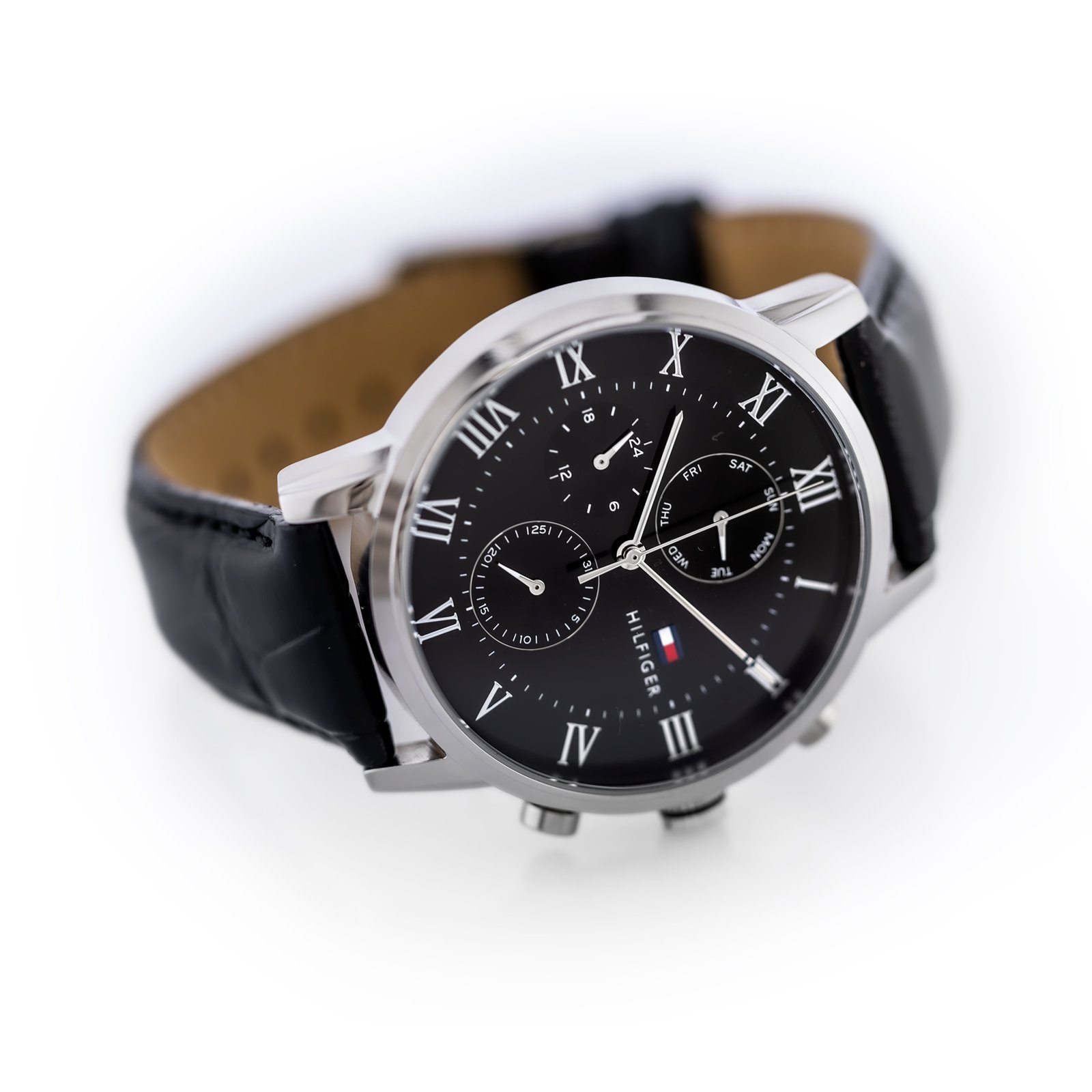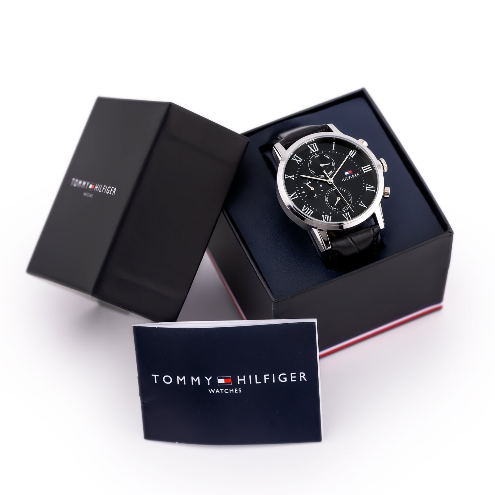 Zegarek męski Tommy Hilfiger Kane 1791401 to połączenie klasyki z nowoczesnym designem, idealny do eleganckich stylizacji, jak i na co dzień. Został wyposażony w czarny skórzany pasek oraz kopertę wykonaną z wysokiej jakości stali nierdzewnej. Tarcza w odcieniu czerni jest czytelna, a mineralne szkło skutecznie chroni ją przed zarysowaniami i uszkodzeniami. Czasomierz działa na precyzyjnym mechanizmie kwarcowym zasilanym baterią. Model ten posiada funkcje datownika dni tygodnia oraz miesiąca, umieszczone przy godzinach 6 i 12, oraz wskazanie czasu w formacie 24-godzinnym. Dzięki wodoodporności na poziomie 30 metrów, zegarek jest odporny na drobne zachlapania.