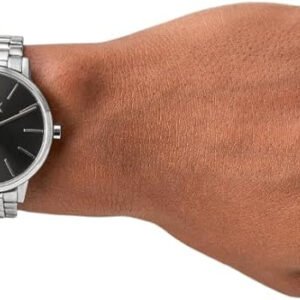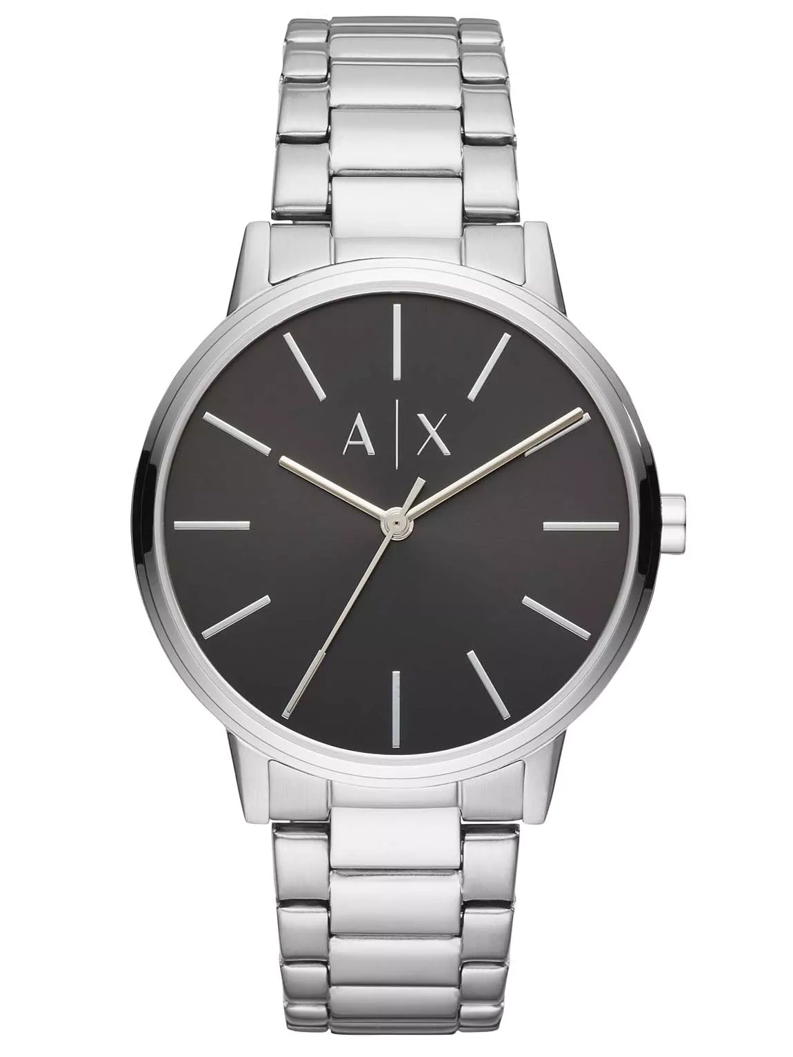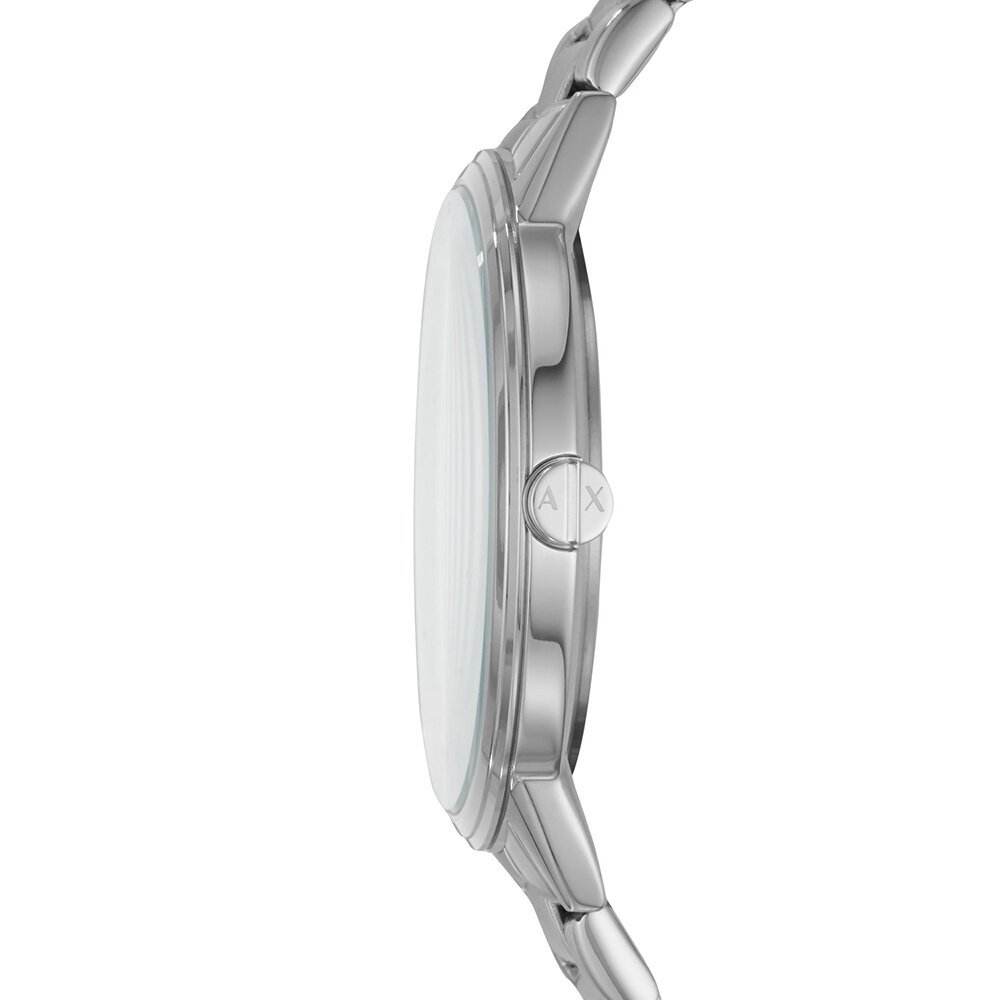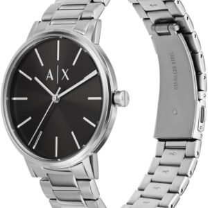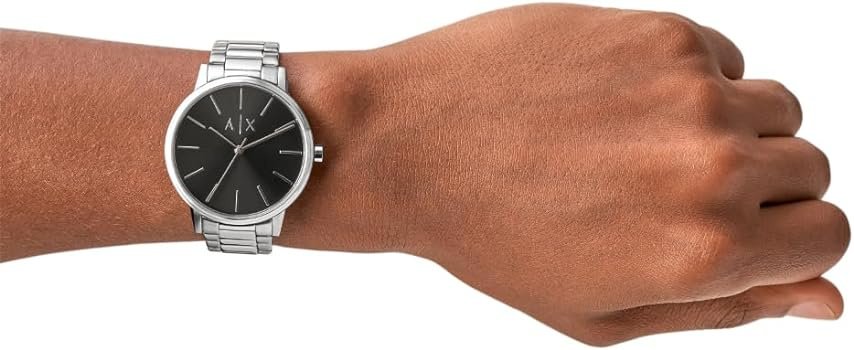 Zegarek męski Armani Exchange AX2700 to elegancki model, który łączy klasyczny wygląd z nowoczesnym akcentem. Jego czarna tarcza z mineralnym szkłem jest subtelna, ale wyróżniająca się, dzięki kontrastującym srebrnym indeksom i wskazówkom. Koperta wykonana z wysokiej jakości stali szlachetnej ma szerokość 42 mm i grubość 8 mm, co nadaje zegarkowi smukły, ale solidny wygląd. Szeroki srebrny pasek (20 mm) z tego samego materiału doskonale komponuje się z całością, zapewniając komfort noszenia.