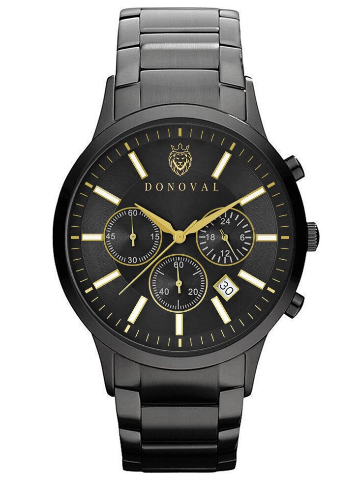 The Donoval Chronostar DL0026 wristwatch is an elegant, classic men’s timepiece – perfect for everyday wear, as well as for special occasions. The envelope and bracelet are made of stainless steel with a high-quality coating in black – this ensures many years of durability. On the black dial protected by mineral glass you will find the day of the month date, subdials that are chronograph indications and hour markers in white and gold. The watch is powered by a Miyota quartz movement.